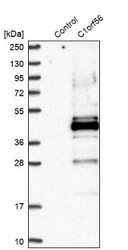 - Western Blot: C1orf56 Antibody [NBP2-32683] - Analysis in control (vector only transfected HEK293T lysate) and C1orf56 over-expression lysate (Co-expressed with a C-terminal myc-DDK tag (3.1 kDa) in mammalian HEK293T cells).