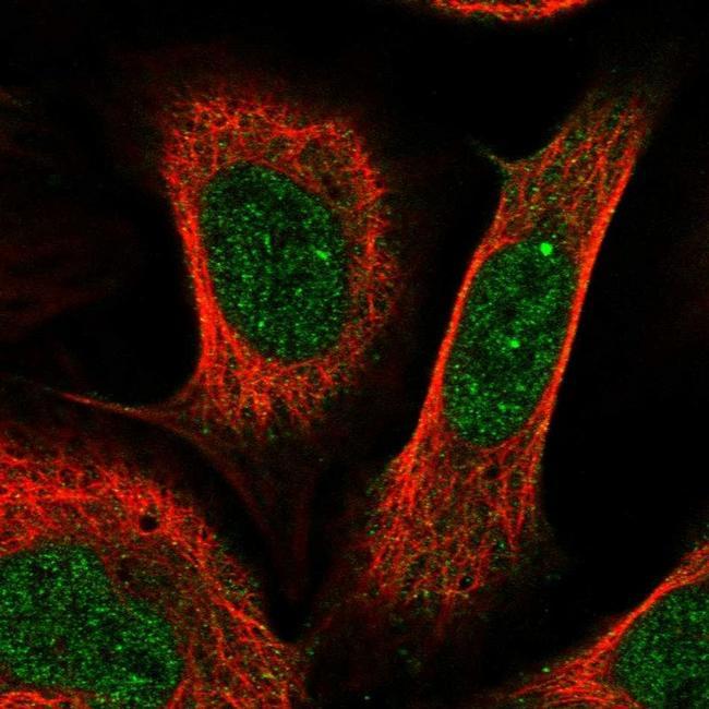 - Immunofluorescent staining of MENT in human cell line U-2 OS shows positivity in cytoplasm & nucleus but excluded from the nucleoli. Samples were probed using a MENT Polyclonal Antibody (Product # PA5-57948).