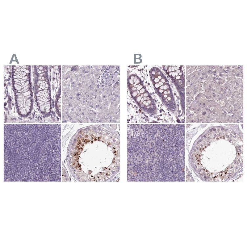 - Immunohistochemical staining of MENT in human colon, liver, lymph node and testis using MENT Polyclonal Antibody (Product # PA5-57949) (A) shows similar protein distribution across tissues to an independent MENT Polyclonal Antibody (B).