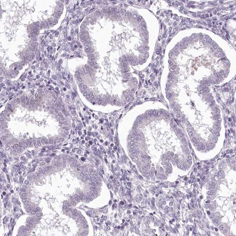 - Immunohistochemical staining of MENT in human endometrium using MENT Polyclonal Antibody (Product # PA5-57949) shows low expression as expected.