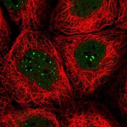 - Immunofluorescent staining of MENT in human cell line A-431 shows positivity in nucleus but excluded from the nucleoli. Samples were probed using a MENT Polyclonal Antibody (Product # PA5-57949).