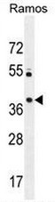 - MGC24975 Antibody (C-term) western blot analysis in Ramos cell line lysates (35ug/lane).This demonstrates the MGC24975 antibody detected the MGC24975 protein (arrow).