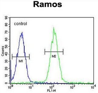 - MGC24975 Antibody (C-term) flow cytometric analysis of Ramos cells (right histogram) compared to a negative control cell (left histogram).FITC-conjugated goat-anti-rabbit secondary antibodies were used for the analysis.