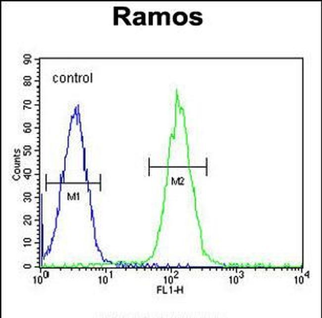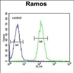 - Flow cytometric analysis of MGC24975 in Ramos cells (right histogram) compared to a negative control cell (left histogram). Samples were incubated with a MGC24975 Antibody (C-term) (Product # PA5-48186) followed by incubation with a FITC-conjugated goat-anti-rabbit secondary antibody.