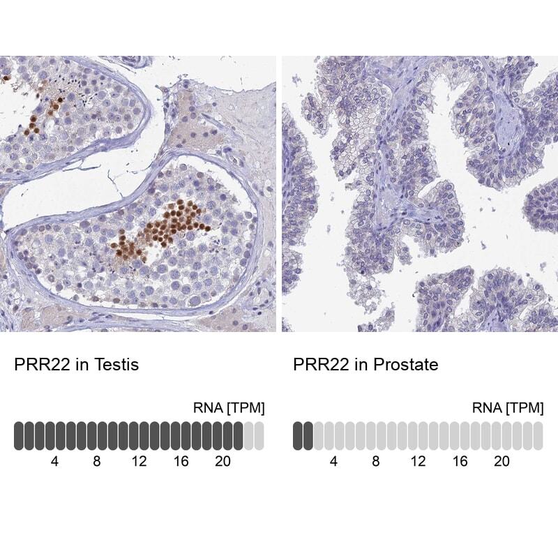 - Immunohistochemical staining of PRR22 in human testis and prostate tissues using PRR22 Polyclonal Antibody (Product # PA5-60633). Corresponding PRR22 RNA-seq data are presented for the same tissues.