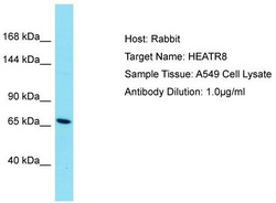 - Host: Rabbit; Target Name: HEATR8; Sample Tissue: A549 Whole Cell lysates; Antibody Dilution: 1.0 ug/ml MROH7 is supported by BioGPS gene expression data to be expressed in A549