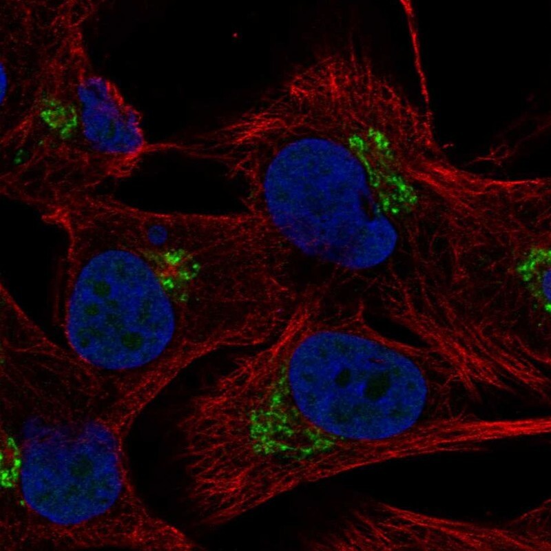 - Immunofluorescent staining of human cell line SK-MEL-30 shows localization to the Golgi apparatus.
