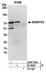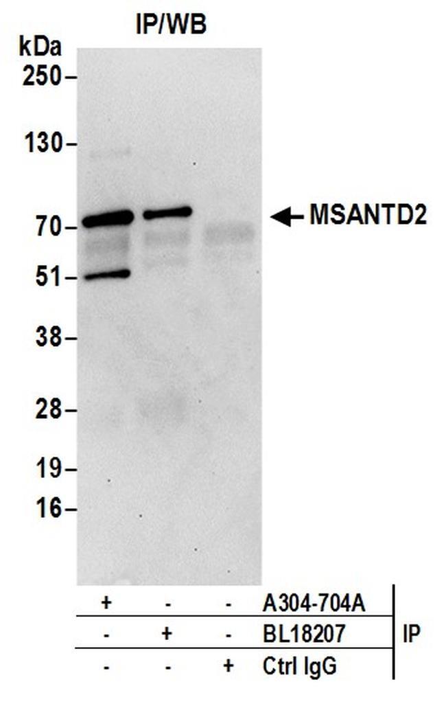 - Detection of human MSANTD2 by western blot of immunoprecipitates. Samples: Whole cell lysate (0.5 or 1.0 mg per IP reaction; 20% of IP loaded) from 293T cells prepared using NETN lysis buffer. Antibodies: Affinity purified rabbit anti-MSANTD2 antibody A304-704A (lot A304-704A-1) used for IP at 6 µg per reaction. MSANTD2 was also immunoprecipitated by rabbit anti-MSANTD2 antibody BL18207. For blotting immunoprecipitated MSANTD2, blotting antibody was used at 0.4 µg/ml. Detection: Chemiluminescence with an exposure time of 30 seconds.