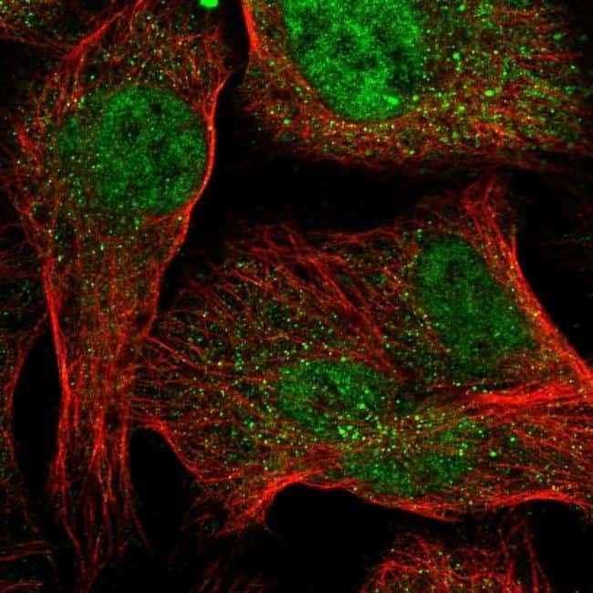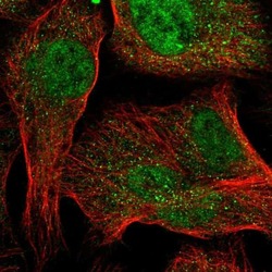 - Immunofluorecent analysis of TMEM39A in human cell line U-2 OS using TMEM39A Polyclonal Antibody (Product # PA5-58669). Staining shows localization to nucleoplasm and vesicles.