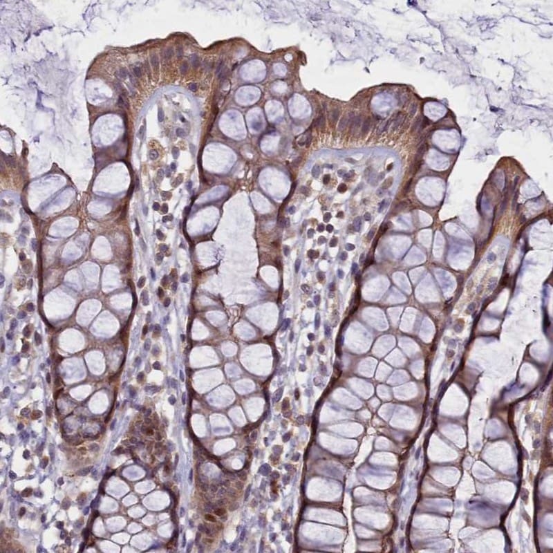 - Immunohistochemical staining of TMEM39A in human rectum using a TMEM39A Polyclonal Antibody (Product # PA5-58669) shows moderate cytoplasmic and membranous positivity in glandular cells.