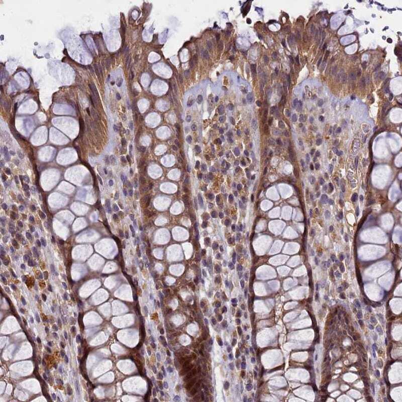 - Immunohistochemical staining of TMEM39A in human rectum using TMEM39A Polyclonal Antibody (Product # PA5-58669) shows moderate to strong cytoplasmic positivity in glandular cells.
