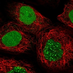 - Immunofluorescent staining of human cell line A-431 with C3orf25 polyclonal antibody ( Cat # PAB27997 ) at 1-4 ug/ml dilution shows positivity in nucleus.