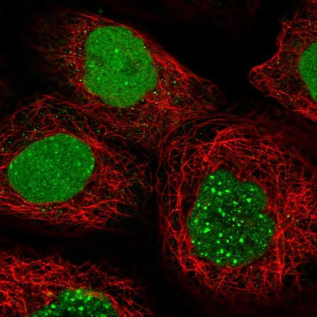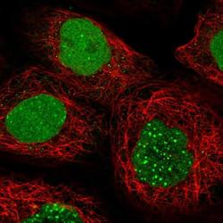 - Immunofluorescent staining of EFCAB12 in human cell line A-431 shows positivity in nucleus. Samples were probed using an EFCAB12 Polyclonal Antibody (Product # PA5-58064).