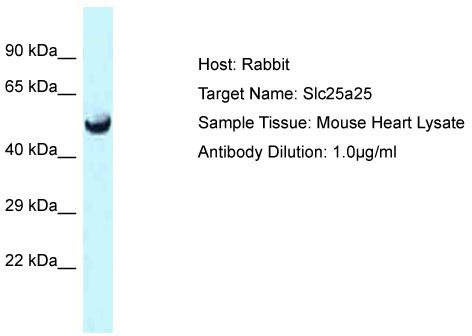 - Host: Rabbit; Target Name: Slc25a25; Sample Tissue: Mouse Heart lysates; Antibody Dilution: 1.0 ug/ml