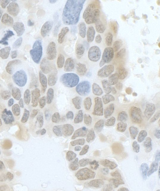 - Detection of human HURP/DLG7 by immunohistochemistry. Sample: FFPE section of human ovarian carcinoma. Antibody: Affinity purified rabbit anti- HURP/DLG7 (Cat. No. A300-852A Lot2) used at a dilution of 1:200 (1µg/ml). Detection: DAB.