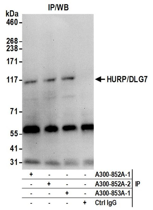 - Detection of human HURP/DLG7 by western blot of immunoprecipitates. Samples: Whole cell lysate (0.5 or 1.0 mg per IP reaction; 20% of IP loaded) from HeLa cells prepared using NETN lysis buffer. Antibodies: Affinity purified rabbit anti-HURP/DLG7 antibody A300-852A (lot A300-852A-2) used for IP at 6 µg per reaction. HURP/DLG7 was also immunoprecipitated by a previous lot of this antibody (A300-852A-1) and rabbit anti-HURP/DLG7 antibody A300-853A. For blotting immunoprecipitated HURP/DLG7, A300-852A was used at 1 µg/ml. Detection: Chemiluminescence with an exposure time of 30 seconds.