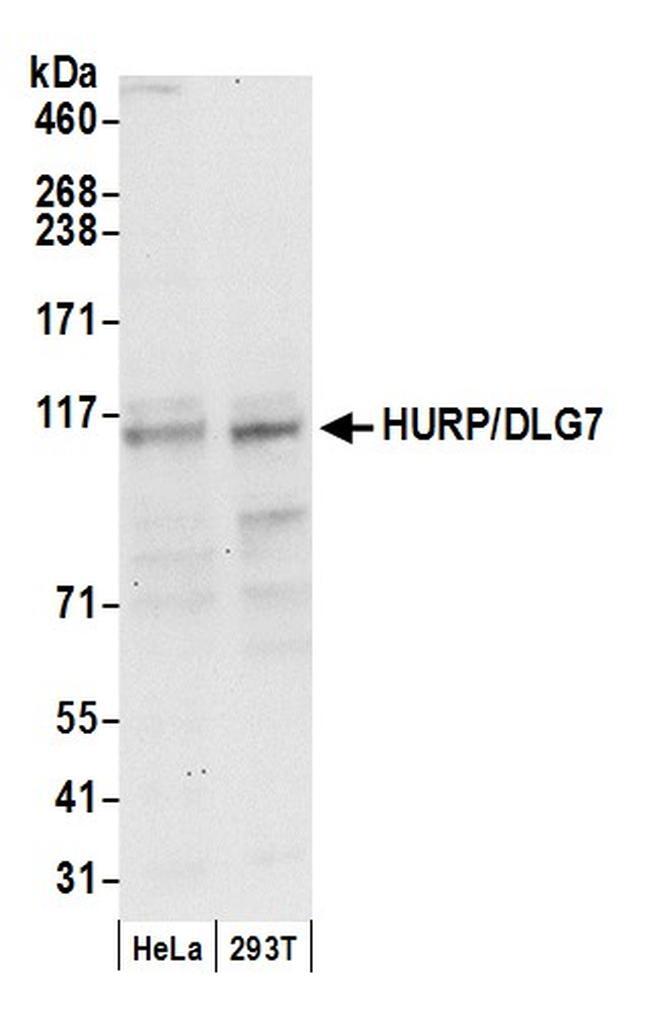 - Detection of human HURP/DLG7 by western blot. Samples: Whole cell lysate (50 µg) from HeLa and 293T cells prepared using NETN lysis buffer. Antibody: Affinity purified rabbit anti-HURP/DLG7 antibody A300-852A (lot A300-852A-2) used for WB at 0.1 µg/ml. Detection: Chemiluminescence with an exposure time of 30 seconds.