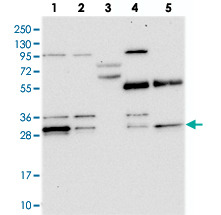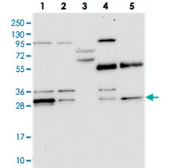 - Western blot analysis of Lane 1: RT-4, Lane 2: U-251 MG, Lane 3: Human Plasma, Lane 4: Liver, Lane 5: Tonsil with PPTC7 polyclonal antibody (Cat # PAB23534) at 1:250-1:500 dilution.