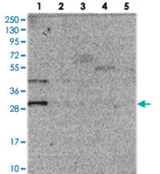 - Western blot analysis of Lane 1: RT-4, Lane 2: U-251 MG, Lane 3: Human Plasma, Lane 4: Liver, Lane 5: Tonsil with PPTC7 polyclonal antibody (Cat # PAB23673).
