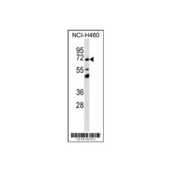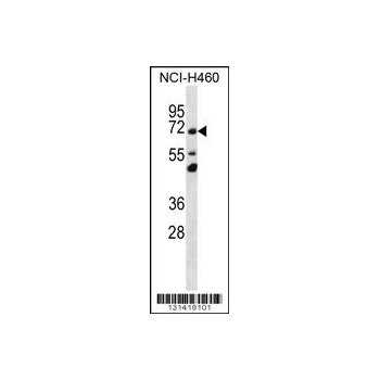 - TM181 Antibody (N-term) (Cat. #OAAB08669) western blot analysis in NCI-H460 cell line lysates (35µg/lane).This demonstrates the TM181 antibody detected the TM181 protein (arrow).