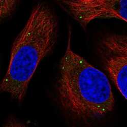 - Immunofluorescent staining of TMEM181 in human cell line U-2 OS shows positivity in vesicles. Samples were probed using a TMEM181 Polyclonal Antibody (Product # PA5-59097).