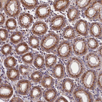 - Immunohistochemistry-Paraffin: TMEM181 Antibody [NBP1-93711] - Staining of human stomach shows strong cytoplasmic positivity, with a granular pattern in glandular cells.
