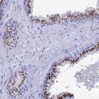- Immunohistochemical staining of human prostate with TMEM244 polyclonal antibody (Cat # PAB24398) shows strong nuclear positivity in glandular cells at 1:50-1:200 dilution.