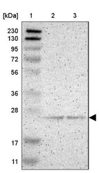 - Western Blot: PDDC1 Antibody [NBP1-93843] - Lane 1: Marker [kDa] 230, 130, 95, 72, 56, 36, 28, 17, 11. Lane 2: Human cell line RT-4. Lane 3: Human cell line U-251MG sp