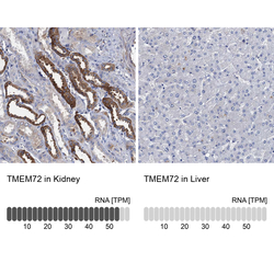 - Immunohistochemistry analysis in human kidney and liver tissues using HPA039894 antibody. Corresponding TMEM72 RNA-seq data are presented for the same tissues.