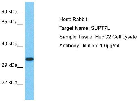 - Host: Rabbit; Target Name: SUPT7L; Sample Tissue: HepG2 Whole Cell lysates; Antibody Dilution: 1.0 ug/ml