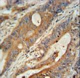 - ZBBX antibody immunohistochemistry of formalin-fixed and paraffin-embedded human colon carcinoma followed by peroxidase-conjugated secondary antibody and DAB staining.