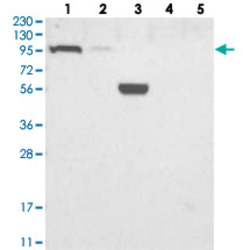 - Western blot analysis of Lane 1: RT-4, Lane 2: U-251 MG, Lane 3: Human Plasma, Lane 4: Liver, Lane 5: Tonsil with ZBBX polyclonal antibody (Cat # PAB22982) at 1:250-1:500 dilution.