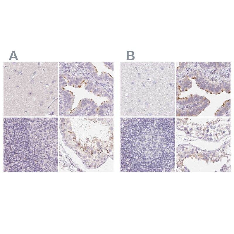 - Immunohistochemical staining of ZBBX in human cerebral cortex, fallopian tube, lymph node and testis using ZBBX Polyclonal Antibody (Product # PA5-57612) (A) shows similar protein distribution across tissues to an independent ZBBX Polyclonal Antibody (B).