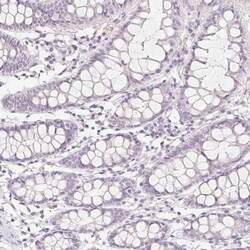 - Immunohistochemical staining of ZBBX in human colon using ZBBX Polyclonal Antibody (Product # PA5-57612) shows low expression as expected.