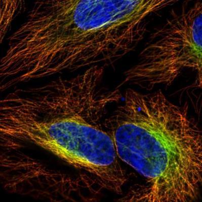 - Immunocytochemistry/Immunofluorescence: VPS13C Antibody [NBP1-94044] - Staining of human cell line HeLa shows localization to microtubules. Antibody staining is shown in green.