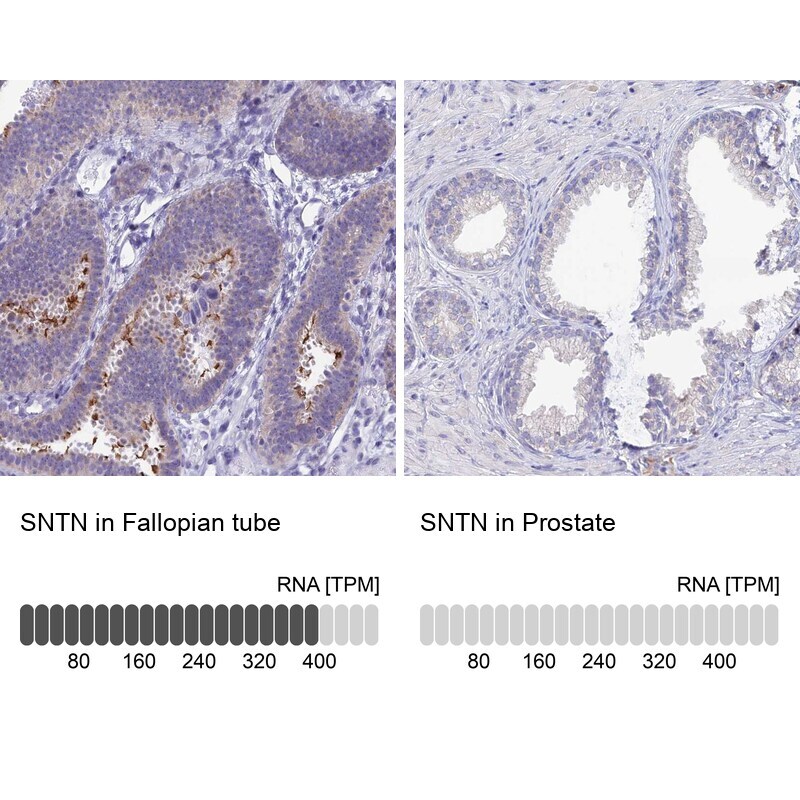 - Immunohistochemical staining of SNTN in human fallopian tube and prostate tissues using SNTN Polyclonal Antibody (Product # PA5-60323). Corresponding SNTN RNA-seq data are presented for the same tissues.
