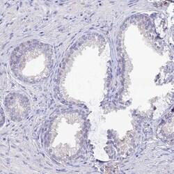 - Immunohistochemical staining of SNTN in human prostate using SNTN Polyclonal Antibody (Product # PA5-60323) shows low expression as expected.