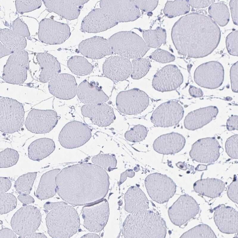 - Immunohistochemical analysis of SNTN in human skeletal muscle using SNTN Polyclonal Antibody (Product # PA5-63565) shows negative cytoplasmic positivity in myocytes as expected.