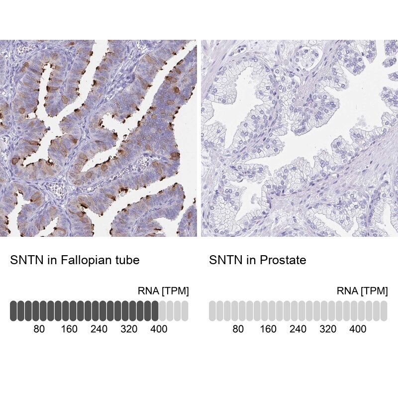 - Immunohistochemical staining of SNTN in human fallopian tube and prostate tissues using SNTN Polyclonal Antibody (Product # PA5-63565). Corresponding SNTN RNA-seq data are presented for the same tissues.