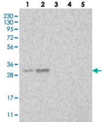 - Western blot analysis of Lane 1: RT-4, Lane 2: U-251 MG, Lane 3: Human Plasma, Lane 4: Liver, Lane 5: Tonsil with LOC153364 polyclonal antibody (Cat # PAB23158) at 1:250-1:500 dilution.