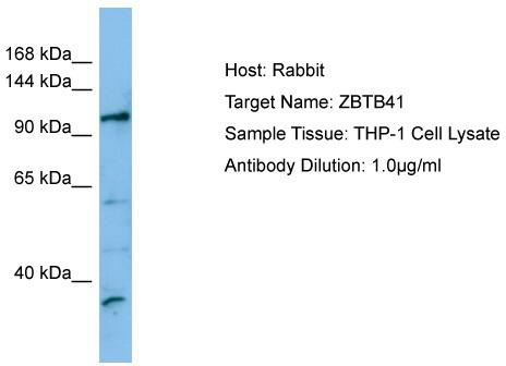 - Host: Rabbit; Target Name: ZBTB41; Sample Tissue: THP-1 Whole Cell lysates; Antibody Dilution: 1.0 ug/ml