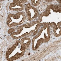 - Immunohistochemical staining of human prostate with ZBTB41 polyclonal antibody (Cat # PAB22835) shows strong cytoplasmic and nuclear positivity in glandular cells at 1:50-1:200 dilution.