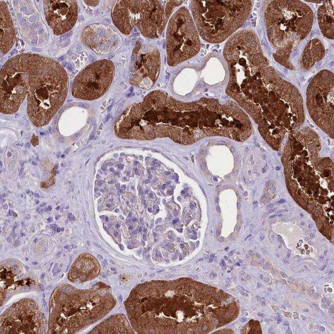 - Immunohistochemical analysis of PRSS53 in human kidney using PRSS53 Polyclonal Antibody (Product # PA5-57092) shows secreted/cytoplasmic positivity in proximal tubules.