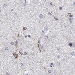 - Immunohistochemical staining of MAP6D1 in human cerebral cortex using MAP6D1 Polyclonal Antibody (Product # PA5-58199) shows strong cytoplasmic positivity in subsets of glial cells.