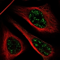 - Immunofluorescent staining of human cell line U-2 OS with C1orf127 polyclonal antibody ( Cat # PAB27993 ) at 1-4 ug/ml dilution shows positivity in nucleus.