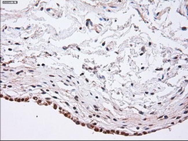 - Immunohistochemical staining of paraffin-embedded human bladder tissue within the normal limits using anti-ACTN1 mouse monoclonal antibody. (Heat-induced epitope retrieval by 10mM citric buffer, pH6.0, 100°C for 10min, TA500072)
