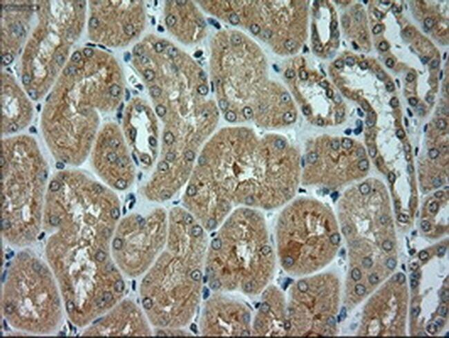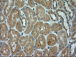 - Immunohistochemical staining of paraffin-embedded human Kidney tissue within the normal limits using anti-ACTN1 mouse monoclonal antibody. (Heat-induced epitope retrieval by 10mM citric buffer, pH6.0, 100°C for 10min, TA500072)