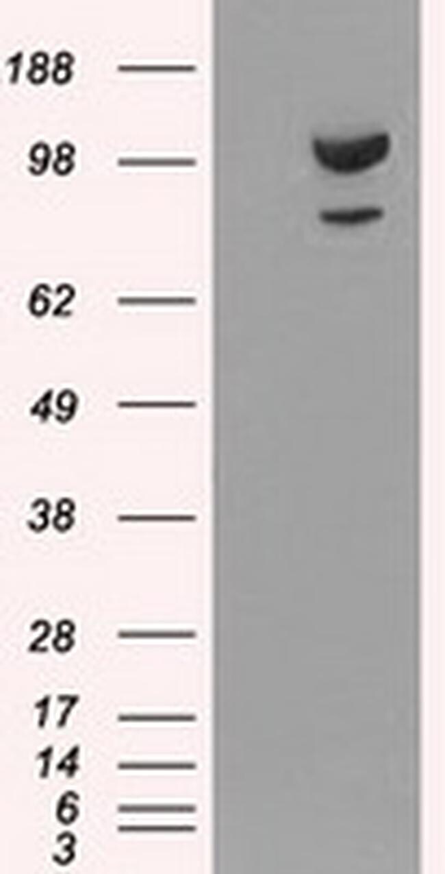 - HEK293T cells were transfected with the pCMV6-ENTRY control (Left lane) or pCMV6-ENTRY ACTN1 (RC204924, Right lane) cDNA for 48 hrs and lysed. Equivalent amounts of cell lysates (5 µg per lane) were separated by SDS-PAGE and immunoblotted with anti-ACTN1. Positive lysates LY400447 (100 µg) and LC400447 (20 µg) can be purchased separately from OriGene.