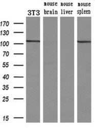 - Western blot analysis of extracts (10 µg) from a mouse cell line and 3 different mouse tissues by using anti-ACTN1 monoclonal antibody. (1:200)