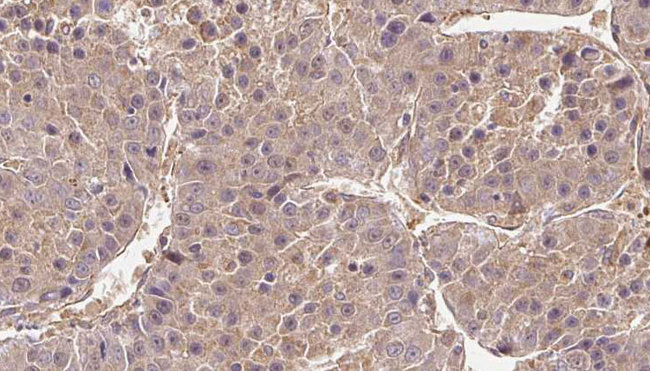 - 1:100 staining human liver carcinoma tissues by IHC-P. The sample was formaldehyde fixed and a heat mediated antigen retrieval step in citrate buffer was performed. The sample was then blocked and incubated with the antibody for 1.5 hours at 22°C. An HRP conjugated goat anti-rabbit antibody was used as the secondary.
